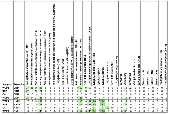 The CoMPP results for CoF confirm the information about its composition in its data sheet, with pectins being absent in both fractions. CoF is mainly composed of xyloglucan and xylan (with signals of LM15, LM25, LM10, and LM23 antibodies in the NaOH fraction).