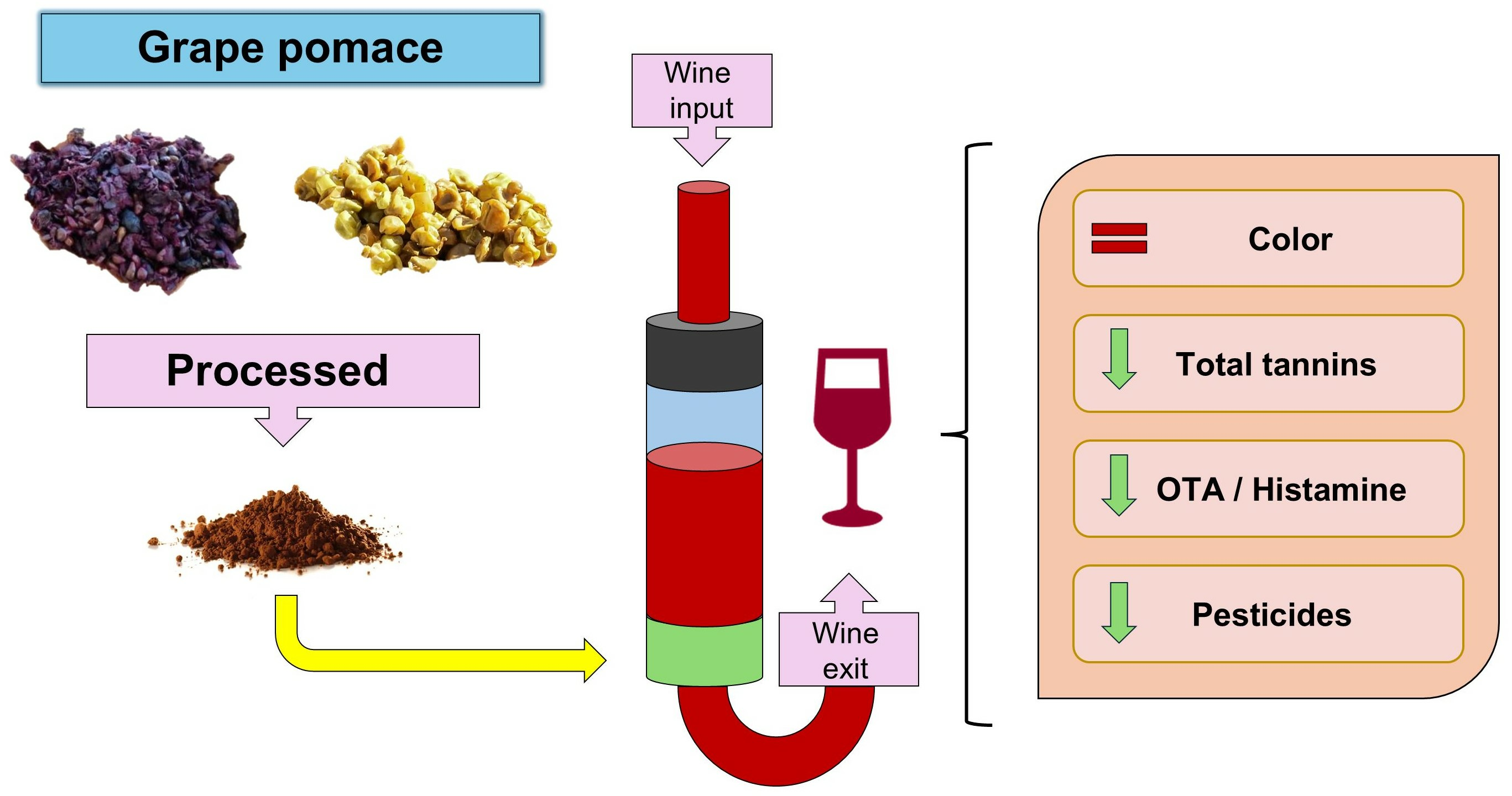 Ensuring the sustainability of the winemaking process is a continuous challenge to which new answers are daily emerging. One of the biggest by-products in the enology industry is grape pomace. Each year, grape crops yield 63 million tonnes worldwide, and 75% of these crops are dedicated to wine production [1]. Approximately 20% of the grapes’ weight constitutes grape pomace, the main winemaking by-product [2]. In Spain alone, 5 million tonnes of fresh grapes were produced in 2023, making it the third largest wine-producing country in the world (OIV) [3].