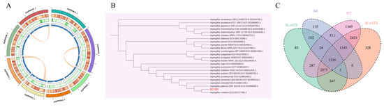 The qualified genomic DNA of EC-520 was sent to Annoroad Gene Technology Co., Ltd. (Beijing, China) for PacBio Sequel II sequencing. A high-quality region finder (HQRF) and the SNR (Signal–Noise Ratio) were used to filter the data. SMRTlink was used to process subreads. Hifiasm was used to assemble reads. BUSCO was used to assess the assembly. RepeatMasker v1.323, RepeatProteinMask v1.36, and RepeatModeler open-1.0.8 were used to predict repeat sequences. Gene structure predictions were performed using PASA v2.1, Augustus v3.3, and SNAP 38926. The genes were annotated through the NCBI and UniProt. We used tRNAscan-SE to predict the tRNA in the genome sequences. Visualization of the genome assembly was performed using Circos. A phylogenetic analysis was carried out between EC-520 and 23 Aspergillus species (downloaded from the NCBI) using tools such as mash, ape, and iTOL.