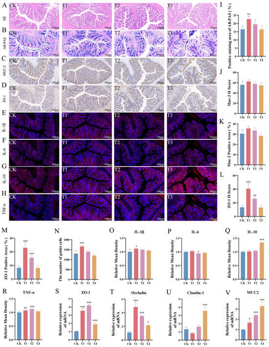 The immunofluorescence analysis of colonic cytokines revealed distinct expression patterns among the treatment groups. The T1 group showed significantly elevated IL-1β expression compared to that in the other groups (p < 0.05) (Figure 2E,O), while the IL-6 levels were markedly reduced in T2 (p < 0.05) (Figure 2F,P). The IL-10 expression was highest in the T3 group (p < 0.05), with no significant differences noted among the other groups (Figure 2G,Q), and the TNF-α levels were significantly higher in T1 and T2 versus those in CK (p < 0.05), with no change observed in T3 (Figure 2H,R).