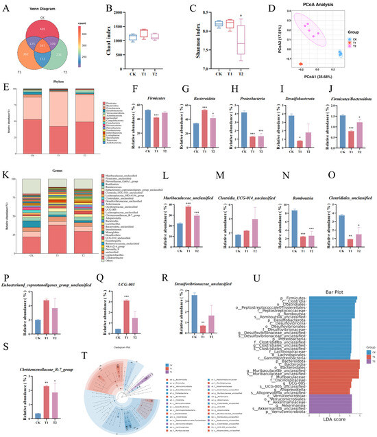 Additionally, at the genus level (Figure 3K), Muribaculaceae_unclassified, Firmicutes_unclassified, Prevotellaceae_Ga6A1_group, Romboutsia, and Ruminococcus dominated the microbiota. The T1 and T2 groups showed a significantly increased presence of Muribaculaceae_unclassified and Christensenellaceae_R-7_group (p < 0.05) but a decreased presence of Clostridiales_unclassified and Romboutsia versus those in CK (p < 0.05). Desulfovibrionaceae_unclassified was reduced while Clostridia_UCG-014_unclassified, Eubacterium_coprostanoligenes_group_unclassified, and UCG-005 were elevated in the T1/T2 groups (Figure 3L–S).