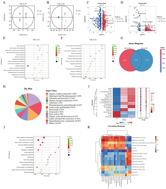 Fold change and VIP values were utilized to identify differential metabolites. Metabolites were classified as differential when they met the criteria of an FC > 2 or <0.5, a VIP > 1, and p < 0.05. The volcanic map results indicated that there were 722 distinct metabolites between the CK and T1 groups, with 506 metabolites up-regulated and 216 down-regulated (Figure 4C). Additionally, 220 different metabolites were identified between the CK and T2 groups, comprising 166 up-regulated and 54 down-regulated metabolites (Figure 4D). The KEGG enrichment analysis showed that pathways such as protein digestion and absorption, histidine metabolism, central carbon metabolism in cancer, and amino acid biosynthesis overlapped between the two comparison groups (Figure 4E,F).