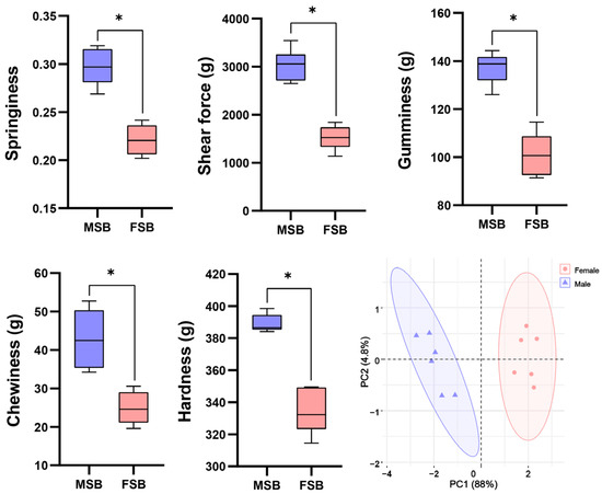 The texture difference between MSB and FSB was shown in Figure 1. Compared with FSB, all the tested textural parameters (hardness, springiness, gumminess, chewiness, and shear force) were higher in MSB (p < 0.05). PCA analysis indicated distinct separation of the textures of MSB and FSB, which represent the differences in texture properties of MSB and FSB. Obviously, the MSB has better toughness. Sexual dimorphism in fish is widely observed in nature, with most studies focusing on external morphology and growth rates. For instance, male tilapia exhibit significantly faster growth rates compared to females [17], whereas in flatfish, the opposite pattern is observed [18]. Sexual dimorphism primarily involves two key mechanisms: first, natural selection may preserve a significant advantage in specific traits of one sex, resulting in the expression of sexual dimorphism even during early life stages; second, sex-related physiological mechanisms can indirectly influence these traits, thereby inducing sexual dimorphism during the process of sexual maturation [19]. Sciaenidae species can make sounds through the vibration resonance of their swim bladder. Due to gender-related behaviors such as courtship, the frequency and intensity of vocalizations of male Sciaenidae are significantly stronger than the females, indicating that male swim bladder may be subject more substantial mechanical stimulation [20]. We speculate that this may be related to the sexual dimorphism of the swim bladder texture, which warrants further investigation.