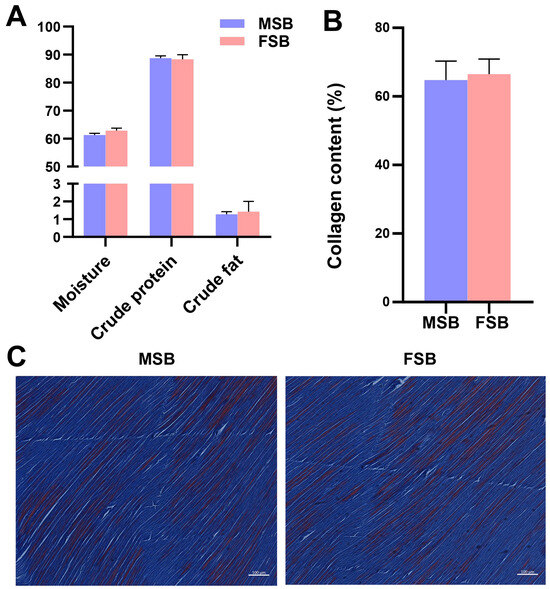 Under the same external conditions, the content and distribution of the major composition (fat, carbohydrate, protein) are one of the important factors affecting tissue texture [21]. However, despite significant differences in the texture of MSB and FSB, no significant differences in the crude composition were noticed (Figure 2A). Notably, the swim bladder of male fish exhibits a slightly lower moisture content and a slightly higher crude protein content compared to that of females, suggesting that male swim bladder may possess a higher proportion of dry matter. The amino acid composition of MSB and FSB is shown in Table 1. Gly is the amino acid residue with the highest content, 15.93% and 15.64%, respectively, showing typical collagen characteristics. Gly represents the most abundant amino acid in collagen molecules, and its repetitive Gly-X-Y constitutes a critical molecular structural characteristic of collagen [6]. But the individual amino acid residues of MSB and FSB also showed insignificant differences. Collagen is the most important structural protein in the extracellular matrix. Many studies have revealed that collagen is essential for maintaining the tensile strength and structural integrity of tissues [22]. Most studies show a positive relationship between collagen content and tissue toughness [23]. But similarly, we found no significant differences in the collagen content of swim bladders between sexes (Figure 2B). This finding was further supported by Masson’s staining of the swim bladder sections (Figure 2C). Through Masson’s staining, the swim bladders of different gender were very similar. Based on the aforementioned findings, although the swim bladder may contain other undetected trace components, our results suggest that the compositional differences are unlikely to be the primary factor contributing to the textural variation between female and male swim bladders.