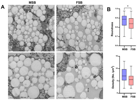 Sexual differences in microstructure of swim bladder. (A) TEM observation of MSB and FSB. (B) Collagen fiber roundness and density of MSB and FSB. Data were shown as mean ± S.D (n (roundness) = 100; n (density) = 20). Statistical analyses were performed using Student’s t-test, * p < 0.05.