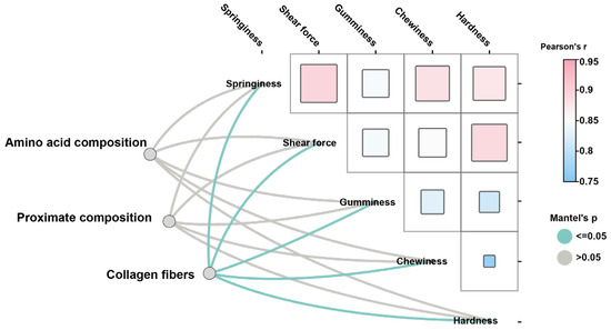 Mantel test analysis of amino acid composition, proximate components, and collagen fiber morphology on swim bladder texture. Mantel test p ≤ 0.05 indicates significant correlation.