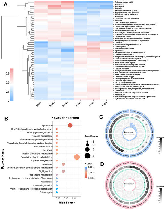 Our results demonstrated that the major sexual difference in swim bladder collagen is related to the structure of collagen fiber. To investigate the molecular mechanism underlying this difference, comparative proteomic analysis of MSB and FSB was conducted. In the proteomic analysis, a total of 952 proteins were annotated, including 471 in the clusters of orthologous groups of proteins (COG) database (Figure S1), 868 in the gene ontology (GO) database (Figure S2), and 512 in the kyoto encyclopedia of genes and genomes (KEGG) database (Figure S3). Most of these proteins are related to protein folding, modification, and transport. Through further comparison of the proteomics, we screened out 49 differentially expressed proteins (DEPs) in female and male swim bladders (Figure 5A). These DEPs were subjected to enrichment analysis of the KEGG pathway database and the GO pathway database, respectively. The KEGG pathway enrichment analysis is a bioinformatics-based methodology designed to identify significantly enriched biological pathways from high-throughput omics data (e.g., transcriptomic, proteomic, or metabolomic datasets), thereby elucidating potential functional mechanisms involving differentially expressed genes, proteins, or metabolites [28]. In the KEGG enrichment pathway analysis, the pathway with the highest significance is “Lysosome”, and the pathway with the highest rich factor is “Regulation of actin cytoskeleton” (Figure 5B). Both pathways are involved in the regulation of the extracellular matrix. Studies have shown that lysosomes regulate collagen protein structure through enzymatic degradation (e.g., cathepsins) and autophagy-mediated extracellular matrix remodeling, with dysfunctions in lysosomal activity linked to collagen accumulation in fibrotic diseases [29]. The regulation of the actin cytoskeleton modulates collagen protein synthesis, alignment, and fibril stability through the regulation of cellular mechanical tension, thereby orchestrating the structural remodeling of the extracellular matrix [30]. “Lysosomes” and “regulation of the actin cytoskeleton” may be potential pathways for the swim bladder to regulate tissue mechanical properties. Gene ontology (GO) pathway enrichment analysis serves as a methodological approach to identify significantly overrepresented biological processes, molecular functions, and cellular components within gene expression datasets, thereby facilitating the interpretation of the biological significance underlying gene expression patterns under specific experimental conditions [31]. Using the number of DEPs in the GO pathway as the screening criterion (Figure 5C), the GO with the most enriched DEPs is GO:0070062 (extracellular exosome). And using the significance of the GO pathway as the screening criterion (Figure 5D), the most significant GO is GO:0032272 (negative regulation of protein polymerization).