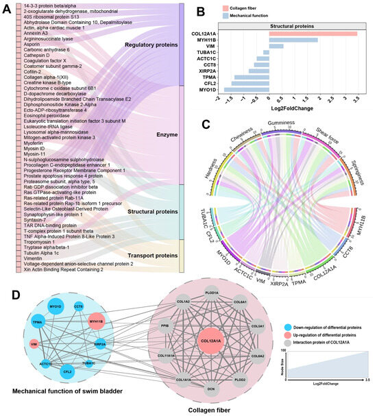Analysis of DEPs associated with differences in swim bladder collagen. (A) Classified DEPs according to enzymes, structural proteins, transport proteins, and regulatory proteins. (B) Log2FoldChange and functions of structural proteins in DEPs. (C) Pearson correlation analysis of structural proteins in DEPs and swim bladder texture. The larger the scale of DEPs, the higher correlation with texture. (D) Protein interaction network of structural proteins in DEPs. The larger the size of the node shape, the higher the Log2FoldChange of protein. Red for up-regulated and blue for down-regulated.