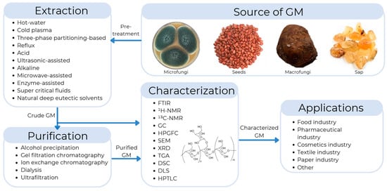 General representation of the extraction, purification, characterization, and applications of galactomannans (GMs).