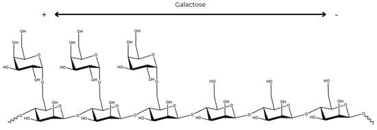 The galactose units are organized as random doublets and triplets along the main chain [5,82]. Such random substitution of the galactose units results in regions of high and low substitution in the mannan main chain (Figure 3). In galactose-sparse regions, non-covalent interactions occur between polymer chains. In galactose-abundant areas, high substitution hinders the formation of more organized structures. This is due to steric hindrance of the side chains, which also leads to high solubility in aqueous solutions [83].