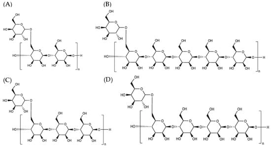 General chemical structures and repeating units of galactomannans: (A) guar gum, (B) cassia gum, (C) tara gum, and (D) algarroba gum [89].