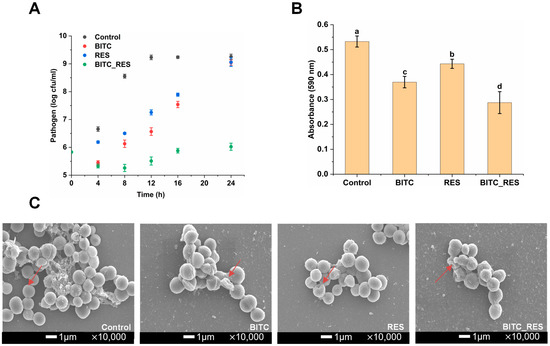 3.2. Synergistic Effects of BITC and RES on S. aureus Biofilm Formation