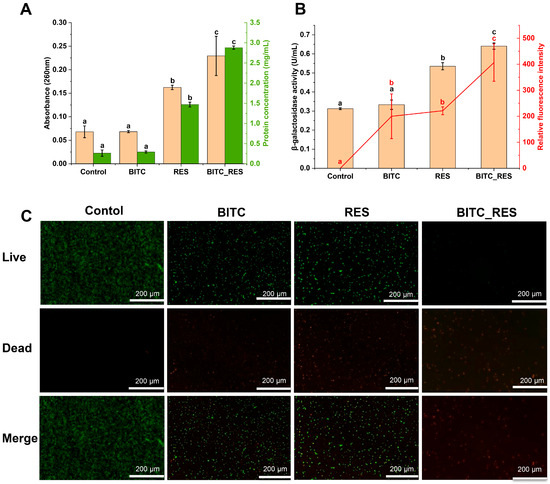 3.3. Synergistic Effects of BITC and RES on the Cell Membrane Permeability of S. aureus