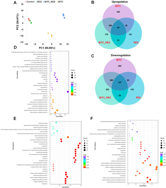 3.4. Synergistic Effects of BITC and RES on the DEGs of S. aureus