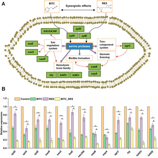 3.5. Synergistic Effects of BITC and RES on Some Key Genes in S. aureus