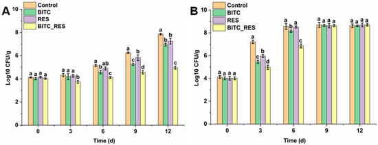 3.6. Synergistic Effects of BITC and RES on S. aureus in Beef at 4 °C and 25 °C