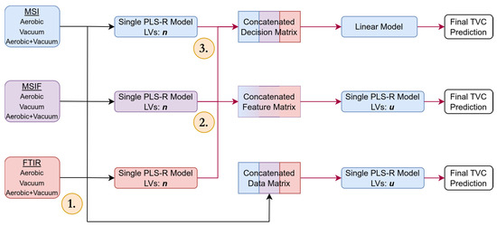 A naive early fusion approach for all conditions was examined, using the same procedure as described by Fengou et al. [23]. The heterogeneity of the data emerging from the project’s MSI, MSIF, and FTIR sensors necessitated preprocessing steps before combining their respective information. From each modality, the data were standardised (z-score normalised) before being concatenated into a single predictor matrix, then used as input for a single PLS regression model. To implement the mid-level approach, the previously developed single-sensor PLS models were used to transform the raw sensor data into the feature space of the respective models. These transformed features were horizontally concatenated into new matrices and used for the construction of a single new PLS model. As before, a repeated k-fold cross-validation scheme was used to determine the optimum number of latent variables. As described earlier, differences in dimensionality or scaling in early and mid-level fusion can lead to concatenated data matrices being dominated by the contributions of one modality [17]. A decision (late) fusion approach was developed alongside the former, which is, by nature, less prone to domination with information from a single modality.