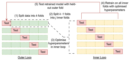 Ten repeats of five-fold nested cross-validation were undertaken with all model/fusion strategies under investigation, and all combinations of data—aerobic, vacuum/modified atmosphere, and combined conditions as before. This was intended to provide a more reliable estimate of model performance across the whole dataset. Each nested cross-validation round consisted of the random shuffling and splitting of the data into five folds, wherein five combinations of four folds were used for the nested hyper-parameter tuning process with an inner five-fold cross-validation procedure. The best candidate’s parameters in this nested validation were used to retrain on the whole inner dataset, and the model was tested with the respective held-out outer fifth fold. This whole process was repeated a further nine times, for a total of fifty assessments of performance, each made with random subsections of training and testing data. The utility of this process in minimising optimistic bias/overfitting in model assessment without split-to-split information leakage when compared to more conventional k-fold cross-validation has been acknowledged by Cawley and Talbot [29]. A schematic of this process is shown in Figure 2. Crucially, employment of the same random seed allows for all folds in the respective assessments using this technique to use the same series of random data splits. This allows for true comparison of model performance on a fold-to-fold basis, removing the opportunity for one algorithm to be assessed on an advantageous series of folds, while disadvantaging other algorithms with alternative splits. A similar approach has been employed by prediction of olive oil sensory descriptors, which coincidentally also explored the efficacy of early and feature-level fusion with PLS modelling [30].