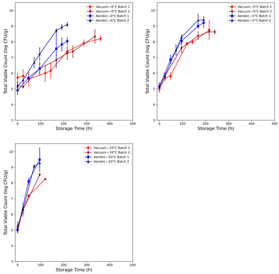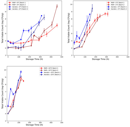 The microbial (TVC) populations for beef mince spoilage are recorded in Figure 4. Initial TVC load for both packaging conditions show separation by batch, of between 0.5 and 1 log CFU/g. Batch 1 of the aerobic and modified atmosphere samples showed initial counts of 4.95, 4.72, and 5.04 log CFU/g at 0 °C, 5 °C, and 10 °C, respectively, whereas batch 2 showed counts of 4.07, 3.91, and 4.02 log CFU/g. This ~0.5–1 log CFU/g difference in initial TVC values seen in both aerobic and modified atmosphere packaging batches likely reflects the common origin of the batches and their simultaneous preparatory steps.