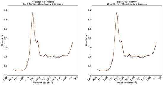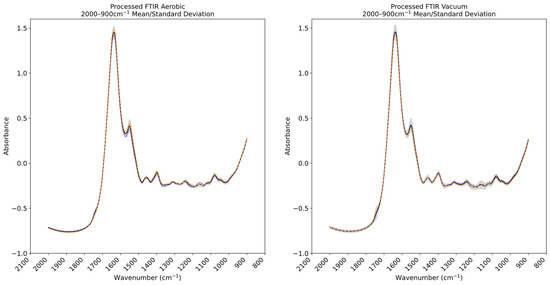 FTIR spectral plots corresponding to the mean and standard deviation recorded within the processed calibration sets of the chicken thigh and beef mince datasets are found in Figure 5 and Figure 6 Previous domain-specific research has highlighted the contribution of the 1800–1400 cm−1 band in spoilage analysis [14]. The spectra gathered through this research corroborate these contributions: large degrees of variance exist in the 1750–1400 cm−1 region indicated by the wide standard deviation margin in both aerobic and vacuum-stored samples, although this is partially obscured by the gradient of the peaks. The spectral regions peaking at ~1550 cm−1 and 1640 cm−1 have been associated with amide II vibrations [39], suggesting the presence of proteins and potential free amino acids, and is concordant with microbial spoilage-related proteolytic changes [40].