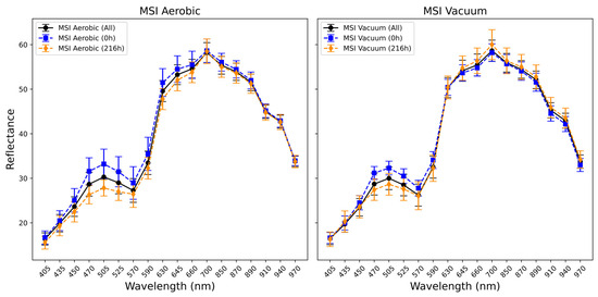 Plot showing mean and standard deviation of spectral values of Multispectral Imaging (MSI) data across the aerobically and vacuum-stored chicken thigh samples (solid black line). Mean and standard deviation values are also indicated for 0 °C/0 h (blue line aerobic n = 10, vacuum n = 8) and 0 °C/216 h (orange line aerobic n = 21, vacuum n = 8).