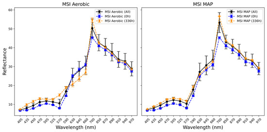 Across the aerobic and modified atmosphere beef MSI measurements in Figure 8, the difference in reflectance between the 0 h and 336 h samples is more uniform across the wavelengths, except for a region in the aerobic data between 590 and 700 nm, in which the overall trend is inverted, with the 336 h samples showing a lesser degree of reflectance. This regional reduction in reflectance has been attributed to an effect similar to that observed with the chicken samples, namely colour changes (browning) due to the breakdown of meat pigment proteins [42].