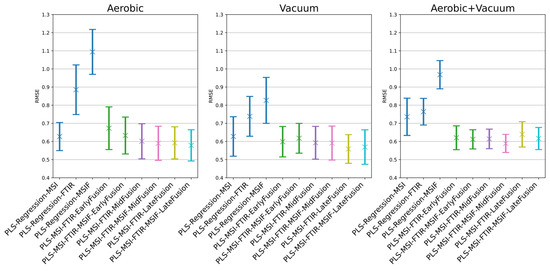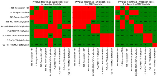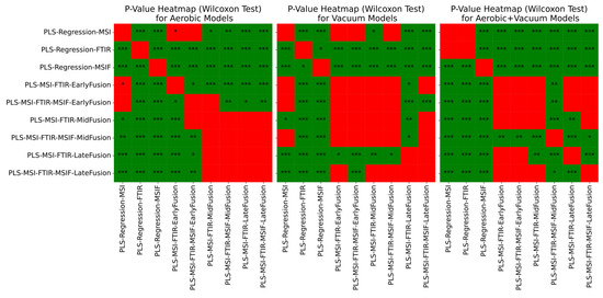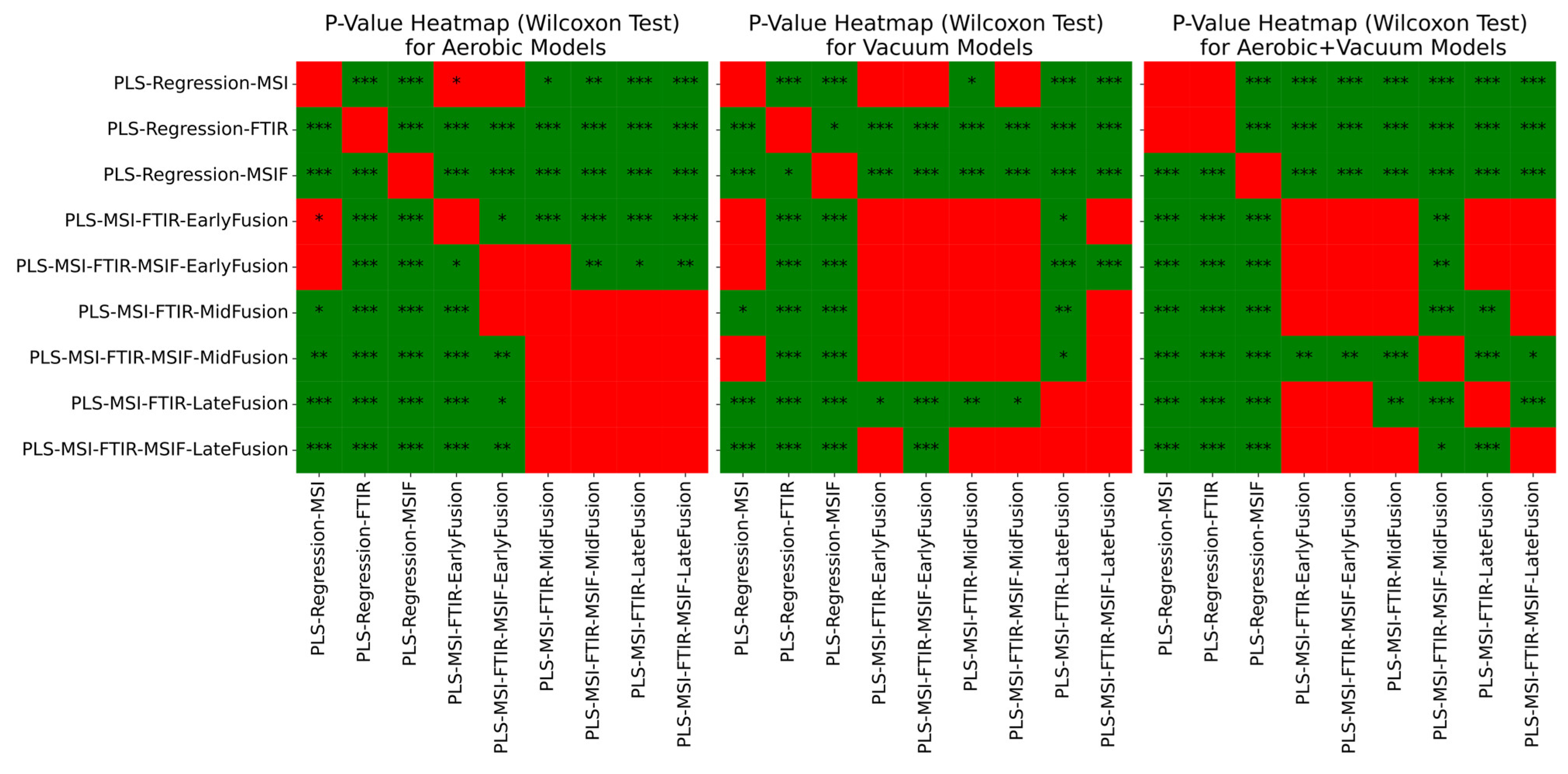 The statistical significance of pairwise model comparisons was assessed using the Wilcoxon signed-rank test on RMSE values across cross-validation folds. To control for multiple comparisons, p-values were adjusted using the Holm–Bonferroni procedure [43], which maintains strong control of the family-wise error rate while providing greater statistical power than the standard Bonferroni correction. Significant increases in median RMSE performance across all scenarios were suggested when employing a late fusion approach, with Wilcoxon signed-rank test p-values < 0.001 (Figure 10). In the combined aerobic/vacuum scenario, all three fusion strategies displayed a significant improvement in median RMSE performance (p-values < 0.001). Interestingly, no significant difference in median performance was found across certain mid- and late fusion configurations in the aerobic and vacuum conditions (p-value > 0.05).