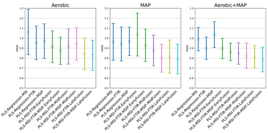 In a similar manner to the chicken spoilage scenario, repeated nested cross-validation was used to assess the generalised performance of the three tiers of fusion approach when compared to the corresponding single-sensor models, albeit with a lesser degree of confidence due to the wider standard deviation envelope. A general downward trend was visible in Figure 11 in mean and standard deviation of RMSE performance when moving from single sensors towards decision (late) fusion methods. Wilcoxon signed-rank tests were used to aid the quantification of the significance of differences in median performance with minimal assumptions as to the underlying distribution of results (Figure 12), with Holm–Bonferroni correction applied. For the aerobic and combined aerobic and MAP conditions, FTIR performance was significantly different to MSI, with Wilcoxon signed-rank p-value < 0.05. Across all scenarios, MSI/FTIR(/MSIF) decision fusion achieved a significant improvement in performance against single-sensor approaches, with p-values of at most 0.001. The performance metrics for the combined aerobic and MAP condition (Table 6) suggest the most convincing improvements to predictive performance by adopting a sensor fusion approach: MSI/FTIR/MSIF mid-/late fusion show an increase in mean accuracy of between 6 and 8% over FTIR alone.