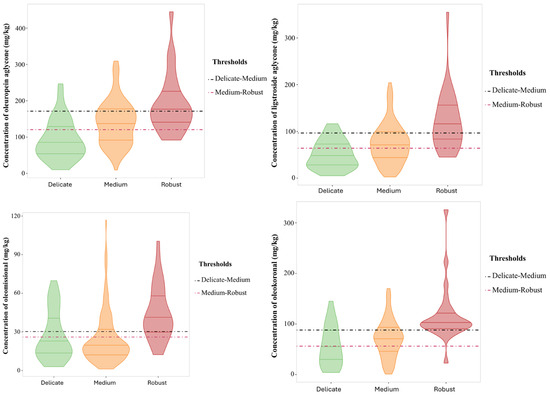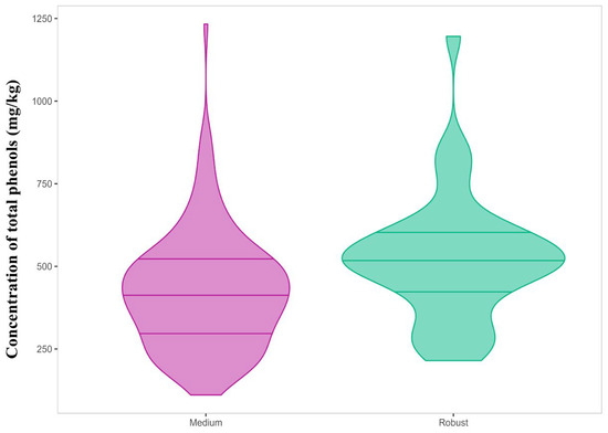 | Robust (nbitterness = 21; npungency = 27) | 6.86 ± 0.36 a | 6.98 ± 0.35 a |