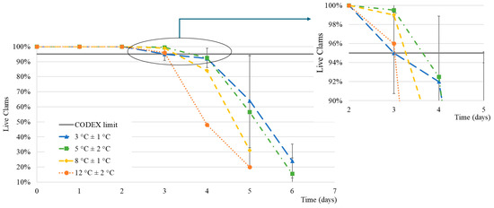 - Anacleto, P.; Maulvault, A.L.; Chaguri, M.; Pedro, S.; Nunes, M.L.; Rosa, R.; Marques, A. Microbiological responses to depuration and transport of native and exotic clams at optimal and stressful temperatures. Food Microbiol. 2013, 36, 365–373. [Google Scholar] [CrossRef]