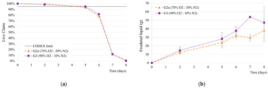 - Gonçalves, A.; Pedro, S.; Duarte, A.; Nunes, M.L. Effect of enriched oxygen atmosphere storage on the quality of live clams (Ruditapes decussatus). Int. J. Food Sci. Technol. 2009, 44, 2598–2605. [Google Scholar] [CrossRef]