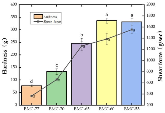 Hardness and shear force are important performance indicators of the texture of fish fillets. It can be seen from Figure 1 that the hardness and shear force of the large yellow croaker fillets significantly increased as the fish water content decreased (p < 0.05). When the water content decreased to 65% (BMC-65), the hardness and shear force were 246.24 and 1260.92, respectively, which were 2.19 times and 2.46 times higher than that of BMC-77. These values were also significantly higher than those of BMC-70 (p < 0.05). However, at lower moisture contents, the changes in shear force and hardness were no longer significant (p > 0.05). The shear forces of BMC-60 and BMC-55 reached 1383.23 and 1552.86 g/sec, respectively, and their hardness increased by 258.75 and 254.29 g compared to BMC-77, indicating that after salting and hot air drying, the water content of the fillets could be reduced, and the texture of the fillets could be significantly changed. This is because after fish is pickled and dried using hot air, the myofibrillar fibers become shorter, and the length of the sarcomere becomes shorter, which makes the fish dry and more tough [40]. At the same time, the evaporation rate of water on the surface of the fish fillet is greater than that of water spreading from the inside to the skin. The skin of the slices loses water and shrinks rapidly to form a dense and compact hard shell. As the baking continues, the formation of the hard skin shell increases, resulting in changes in the texture of the fish and an increase in the shear force. This is consistent with the results of Serra et al. [41], who found that the hardness and chewable shear force indexes of meat products were negatively correlated with their water content.