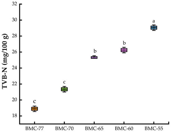 Effects of different water contents on TVB-N value of large yellow croaker fillets. (a,b,c: indicate that different treatments have significant differences, p < 0.05).