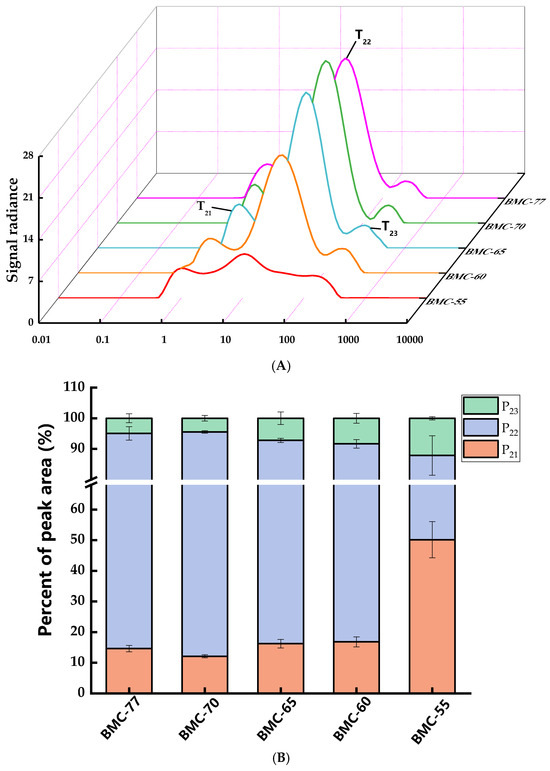 Low-Field Nuclear Magnetic Resonance (LF-NMR) technology can effectively elucidate the state, distribution, and migration characteristics of water within large yellow croaker fillets. The main parameters measured included the transverse relaxation time (T2) and signal amplitude. The T2 relaxation time can reflect the degree of binding between water and substrates. The smaller the T2 value, the closer the binding, the lower the water freedom, and the position of the peak in the T2 map will shift toward the left side. The states can be categorized into three types: T21 (0–10 ms) for bound water; T22 (10–100 ms) for immobilized water within the myofibrillar structure; and T23 (100–1000 ms) for free water within the myofibrillar structure [48]. Figure 4A shows the T2 inversion spectra of the large yellow croaker fillets with different water contents roasted at 220 °C for 20 min. Compared to BMC-77, the T21, T22, and T23 of BMC-65 were significantly decreased (p < 0.05). The T22 of BMC-60 and BMC-55 were significantly lower compared to that of the BMC-65 fillets (p < 0.05). This is consistent with the trends in the T2 inverse spectrum, in which the BMC-70 fillets exhibited the highest P22 and the lowest P21 and P23 (Figure 4B). Compared to BMC-70, the P22 of BMC-65 decreased by 45.72%, while the P21 and P23 increased by 38.04% and 7.68%, respectively. This indicates that as the water content decreased, the immobilized water in the fillets tended to transform into free water after roasting. A possible explanation for this is that the myofibrillar contraction during processing prevents the loss of immobilized water and transforms it into free water. Simultaneously, the immobilized water content decreased during roasting, leading to a reduction in its percentage and a significant increase in the percentage of bound water. These findings are consistent with the results of Liu et al. [49] who observed a similar transformation of immobilized water into free and bound water during the roasting of duck. Additionally, Sultana et al. [50] found that the lower the water content of fish fillets, the higher the accumulation of macromolecular reaction products, causing myofibrillar contraction and enhancing the water-binding capacity of the tissue structure. Macromolecular substances such as lipid molecules lack the protection of water molecules, and the area exposed to air is large, making it easy for them to contact oxygen and thereby accelerating their oxidation [51]. These results are consistent with the TBARS results: BMC-55, with its lower water content, had a significantly higher TBARS content than that of BMC-65 (p < 0.05). The change in P21, P22, and P23 will also affect the Maillard reaction: if the free water content is too high, the high dilution will slow down the rate of the Maillard reaction, but if the content is too low, the temperature of the reaction system will rise, and the Maillard reaction becomes accelerated. However, the high temperature may lead to excessive reactions, resulting in undesirable flavors and colors. At the same time, the presence state of water is closely related to volatile flavor compounds. Zhang et al. [52] found that changes in the water state in food affect the protein structure and change the binding sites of proteins and volatile substances, thereby affecting the production of volatile flavor compounds. Some studies have found that the immobile water content is positively correlated with the isovaleraldehyde and heptanaldehyde contents and negatively correlated with the nonanal content [31].
