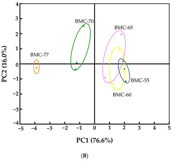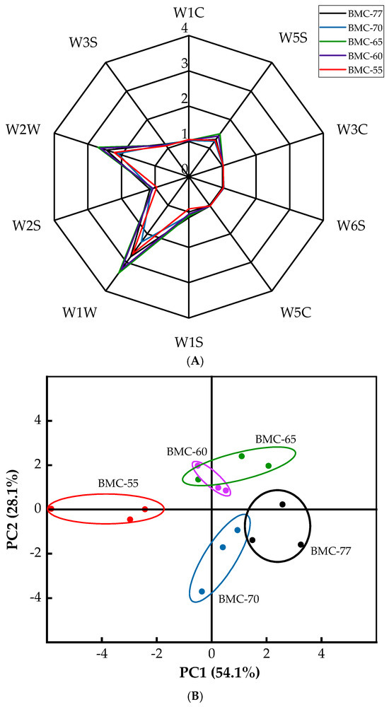 Electronic noses are a common tool for identifying and analyzing the aroma of samples. PCA is a mathematical dimensionality reduction technique for visualizing the differences between groups of samples [54]. The radar charts of the odor profiles generated using 10 odor sensors for the large yellow croaker fillets with different water contents are shown in Figure 5A. The results showed that the W1W (sensitive to sulfides), W2W (sensitive to aromatic components and organic sulfides), and W5S (highly sensitive to nitrogen oxides) sensors exhibited the strongest response to volatile compounds in the roasted large yellow croaker fillets. Notably, in the BMC-65 samples, the W5S, W6S, W1W, and W2W odor values were significantly higher than those of the other groups, reaching 1.51, 1.04, 3.37, and 2.70, respectively.
