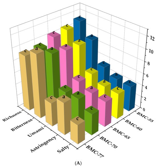 Electronic tongues are intelligent bionic taste systems that simulate the taste buds on the human tongue, converting electric potential values into taste values. They can distinguish and quantify basic tastes such as sourness, sweetness, bitterness, umami, and saltiness in fish fillets. Therefore, an electronic tongue was used to measure the taste differences in the roasted large yellow croaker fillets with different water contents, and the taste profiles of the fillets were constructed using the response intensities of the sensors. As can be seen from Figure 6A, the water content of the fillets significantly influenced the bitterness, astringency, astringent aftertaste, richness, saltiness, and umami after roasting (p < 0.05). Significant differences were observed in umami, richness, and saltiness between the BMC-77 and BMC-65 groups (p < 0.05), but no significant differences were found between the BMC-65, BMC-60, and MC-55 groups (p > 0.05). When the water content of the fillets was 65% (BMC-65 group), the umami value reached 5.12 after roasting, which was 1.29 times that of the BMC-77 group, and the richness increased by 11.45 compared to the BMC-77 group. Similarly, the saltiness of the BMC-65 group was 1.33 times that of the BMC-77 group, while the astringency value was significantly reduced by 18.15% compared to the BMC-77 group. These results indicate that the salting and drying process altered the water content of the fillets, thereby affecting their taste components after roasting. The electronic tongue results were analyzed using PCA. Figure 6B shows that PC1 (76.6%) and PC2 (16.0%) accounted for 92.6% of the total variance, indicating that the model can explain the results of all the samples. As the water content decreased, the projection (VIP) of the samples shifted toward the positive axis of PC1, suggesting that the salting and drying processes significantly altered the taste characteristics of the large yellow croaker fillets. The projections of the BMC-65 group overlapped with those of the BMC-60 and BMC-55 groups, indicating that these groups had similar taste characteristics. The results demonstrated that the taste of the roasted yellow croaker fillets changed due to the differences in water content, with significant differences between the BMC-77 and BMC-70 groups compared to the BMC-65 group (p < 0.05) but no significant differences between the BMC-65, BMC-60, and BMC-55 groups (p > 0.05).