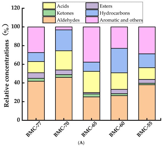 As can be seen from Figure 7B, 7, 6, 9, 10, and 10 aldehydes were detected in the five groups, including heptyl aldehyde, capric aldehyde, benzaldehyde, and nonal. The BMC-70 group, which underwent salting before roasting, exhibited accelerated lipid oxidation, leading to an increase in the production of certain aldehydes (Figure 7A), but the variety of aldehydes was significantly lower than that in BMC-77. After salting and drying, the reduction in the water content resulted in an increase in the relative concentration of aldehydes since the hot air drying and roasting promoted the thermal oxidative decomposition of lipids, producing more aldehydes and increasing their variety. Gao et al. [61] also found that the variety of aldehyde compounds in air-dried hairtail gradually increased.