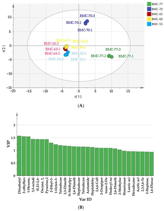To further determine how the different volatile organic compound profiles led to the differences between the samples, a partial least squares discriminant analysis (PLS-DA) model was generated [63]. The goodness-of-fit parameters (R2X), model explanatory ability (R2Y), and predictive ability (Q2) were 0.942, 0.994, and 0.986, respectively, indicating that the model had good robustness and predictive ability. According to Figure 8A, the five groups could be classified into three categories: BMC-77 was concentrated in the fourth quadrant; BMC-70 was concentrated in the first quadrant; and BMC-65, BMC-60, and BMC-55, which showed no significant differences, were concentrated in the third quadrant. Then, the parameters of the five groups were further distinguished using the Variable Importance in Projection (VIP) method. The higher the VIP value of a variable, the more significant its contribution is in distinguishing between the groups. As shown in Figure 8B, a total of 23 compounds with a VIP value >1 were identified, including heptyl aldehyde, decylaldehyde, diisobutyl phthalate, acetamide, dodecyl aldehyde, dodecane, heptaaldehyde, trans-2,4-decenal, trans-2-decenal, n-methyl-2-pyrrolidine, 2-ethyl-5-methylpyrazine, 2-ethylhexyl acetate, 2-ethyl-3-dimethyl-1-hexene, 3,4-dimethyl-1-hexene, 3,7-dimethyl-1,6-octanediene-3-ol,2-piperazinone, 2,6-dimethylpyrazine, 2,4,6-trimethylpyridine, 2,3-dimethyl-5-ethyl pyrazine, 2,3,5,8-tetramethyldecane, 1-octane-3-ol, (E,E)-3,5-octanediene-2-one, and dodecyl nonyl ether. These compounds can serve as markers for the aroma compounds in roasted large yellow croaker fillets [64].