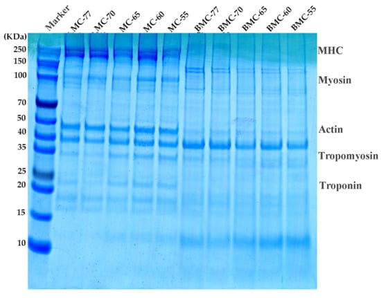 The MHC bands were clearly visible, while the actin bands remained largely unchanged. The tropomyosin bands and troponin I bands in BMC-65, BMC-60, and BMC-55 gradually increased in intensity as the drying degree increased, indicating that a heating treatment could cause the degradation of macromolecular proteins. These findings are consistent with the results reported by Zhang et al. [65].