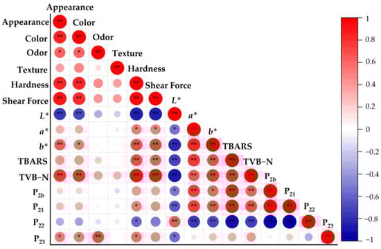 Correlation analysis of quality characteristics of roasted fish fillets of large yellow croaker with different water contents (*: p > 0.05; **: p < 0.01).