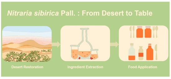 Nitraria sibirica Pall., a halophytic shrub native to arid and saline–alkaline ecosystems, represents a dual-purpose resource for ecological stabilization and functional food development. This review synthesizes current knowledge of its bioactive compounds and pharmacological properties, while identifying research gaps in stress-induced metabolic regulation. The plant contains diverse phytochemicals including phenolic glycosides (e.g., clovin), alkaloids (e.g., nitraramine), immunomodulatory polysaccharides, and anthocyanins, which collectively demonstrate superior antioxidant capacity (freeze-dried polysaccharides outperform Butylated Hydroxytoluene (BHT)), significant antihypertensive effects via angiotensin-converting enzyme (ACE) inhibition and nitric oxide (NO) pathway activation, and broad-spectrum antimicrobial activity against foodborne pathogens. Notably, its pectin components reduce allergen absorption by 72%, suggesting potential as hypoallergenic food additives. These findings validate traditional medicinal uses while revealing novel applications in functional foods and nutraceuticals. Despite promising preclinical results, key challenges remain in understanding compound synergies under environmental stress and translating findings to human applications. Future research should employ multi-omics approaches to elucidate stress-adaptive phytochemical biosynthesis, coupled with clinical validation and sustainable cultivation methods. As a model species for ecological and nutritional applications, N. sibirica offers innovative solutions for addressing both global health challenges (metabolic disorders) and environmental concerns (soil rehabilitation), positioning it at the forefront of climate-resilient agricultural innovation.