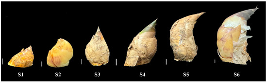 Bamboo shoot phenotypes across developmental stages S1–S6. The white vertical line represents a scale bar, equivalent to 1 cm.