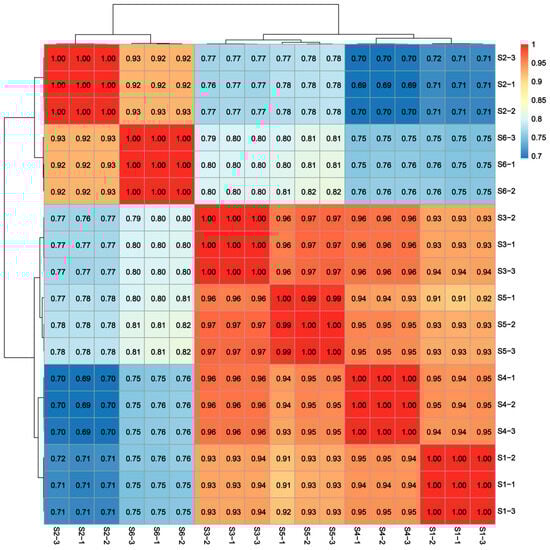 The transcriptome sequencing of 18 samples (The six developmental stages (S1–S6, Figure 1) were each replicated three times) was completed, yielding a total of 132.14 Gb of clean data, with each sample providing at least 6.68 Gb of clean data. The Q30 base percentage was consistently above 91.28% (Table S2). Following de novo assembly, a total of 162,760 Unigenes were obtained, with 42,607 Unigenes exceeding 1 kb in length. The clean reads from each sample were aligned to the assembled reference genome, with alignment efficiency ranging from 76.92% to 78.42%. The sample correlation coefficients of the data indicated that both the throughput and quality of the sequencing were sufficiently high to support further analysis (Figure 2).