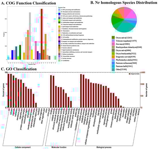 Functional annotation and classification of all unigenes identified in bamboo. (A) Determined by Cluster of Orthologous Groups (COG). (B) Determined by Non-redundant (NR). (C) Determined by gene ontology (GO) databases.