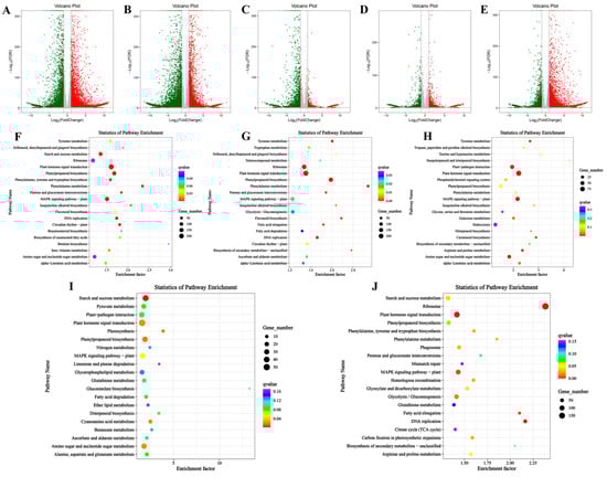 Volcano map and KEGG enrichment analysis of DEGs at different developmental stages. (A–E): Volcano map of DEGs at different developmental stages. (A) KEGG enrichment analysis of DEGs between S1 vs. S2. (B) KEGG enrichment analysis of DEGs between S2 vs. S3. (C) KEGG enrichment analysis of DEGs between S3 vs. S4. (D) KEGG enrichment analysis of DEGs between S4 vs. S5. (E) KEGG enrichment analysis of DEGs between S5 vs. S6. F-J: KEGG enrichment analysis of DEGs at different development stages. (F) KEGG enrichment analysis of DEGs between S1 vs. S2. (G) KEGG enrichment analysis of DEGs between S2 vs. S3. (H) S3 vs. S4. (I) KEGG enrichment analysis of DEGs between S4 vs. S5. (J) KEGG enrichment analysis of DEGs between S5 vs. S6.