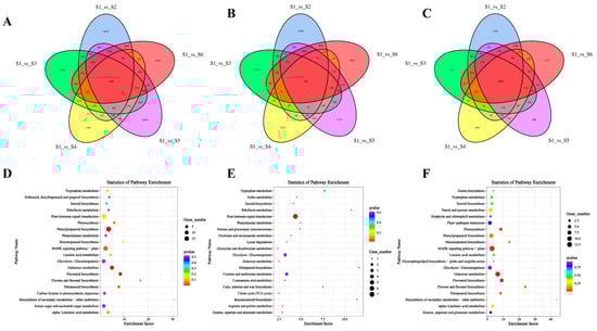 Common DEGs KEGG enrichment analysis at different developmental stages. (A–C): Venn diagram of common DEGs at different developmental stages (S1 vs. S2, S1 vs. S3, S1 vs. S4, S1 vs. S5, S1 vs. S6). (A) Venn diagram of common DEGs. (B) Venn diagram of the up-regulated common DEGs. (C) Venn diagram of the down-regulated common DEGs. (D–E): KEGG enrichment analysis of common DEGs at different developmental stages. (D) KEGG enrichment analysis of common DEGs. (E) KEGG enrichment analysis of up-regulated common DEGs. (F) KEGG enrichment analysis of the down-regulated common DEGs.