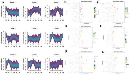 The classification of co-expressed gene clusters at different developmental stages and the main KEGG enrichment pathways at each stage. (A) The classification of co-expressed gene clusters. (B) Main KEGG enrichment pathways at S1 development stage. (C) Main KEGG enrichment pathways at S2 development stage. (D) Main KEGG enrichment pathways at S3 development stage. (E) Main KEGG enrichment pathways at S4 development stage. (F) Main KEGG enrichment pathways at S5 development stage. (G) Main KEGG enrichment pathways at S6 development stage.