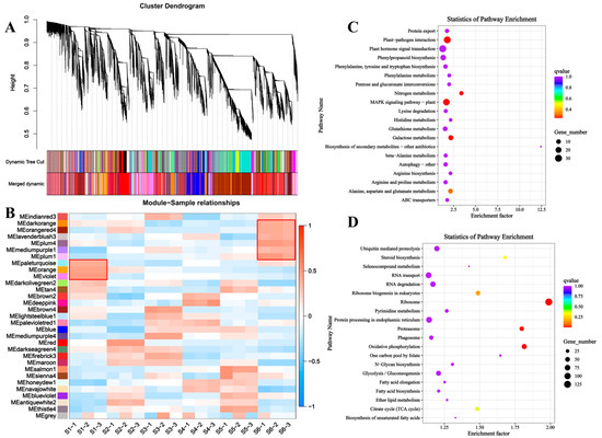 Identification of genes responsive to bamboo shoot tips different development stages by WGCNA analysis. (A) Hierarchical cluster tree showing co-expression modules. (B) Module–sample association. (C) KEGG enrichment analysis of genes involved in the early developmental stages (S1) of bamboo shoot tips. (D) KEGG enrichment analysis of genes involved in the final developmental stages (S6) of bamboo shoot tips.