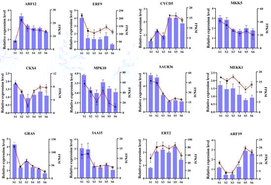 To validate the accuracy of the sequencing data and further explore the expression patterns of genes potentially playing key roles in bamboo shoot development, primers were designed for 12 differentially expressed genes for RT-qPCR verification and expression analysis. The RT-qPCR analysis further validated the RNA-seq findings, as the expression patterns of the differentially expressed genes (DEGs) closely mirrored those observed in the RNA-seq data (Figure 8), thereby confirming the reliability of the transcriptomic results.