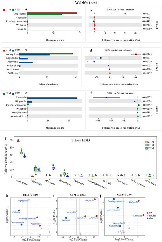 Pairwise contrasts of fungal genera across grades. (a–f) Welch’s t-test estimates of mean proportion differences with 95% CIs; (g) Tukey HSD test. Different superscript letters within a genus denote significant differences among grades (p < 0.05). (h–j) Volcano plots (log2 fold change vs. –log10 p) for C1M vs. C2M, C1M vs. C3M, and C2M vs. C3M. Volcano plots based on OPLS-DA. OTUs meeting the criterion of VIP > 1 were selected for comparative analysis.